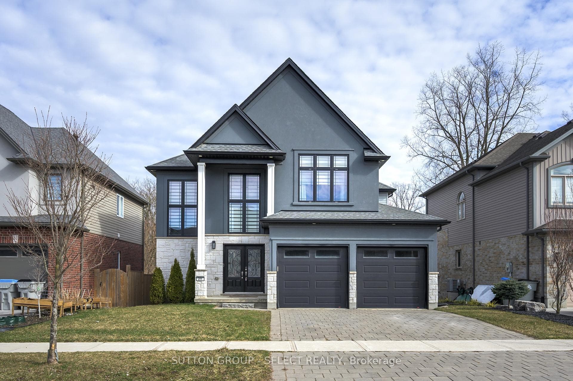 Welcome Home at the impressive 211 Union Avenue in quiet Komoka backing onto a green space. Modern and striking curb appeal stands apart with its deep hues, interlock brick drive, stone & stucco facade, and double-door front entry. Step into the soaring two-storey foyer beautifully illuminated by cascading chandeliers. The main floor offers a designated office space, a living room with a central gas fireplace - framed by a feature wall w/ linear stone wall niches with down lighting - and a sunshine-filled chef's kitchen + dining space featuring premium stainless steel appliances, a contrast centre island, quartz and granite surfaces, upscale pendant lighting and gleaming cabinetry, all overlooking the maturity of the green space, step-down deck, & fully fenced yard. 9' ceiling heights and gleaming hardwood throughout the main floor principal living areas as well. Four spacious bedrooms upstairs including the Primary, which offers 2 walk-in closets and a spa inspired 5pc ensuite. 4pc common bath. The bright lower level offers an additional bedroom, recreation room, full bath, a wet-bar rough in, and plenty of storage. Painted in contemporary, neutral tones throughout. Design and stunning attention to detail throughout. Bright open spaces and elevated finishes.