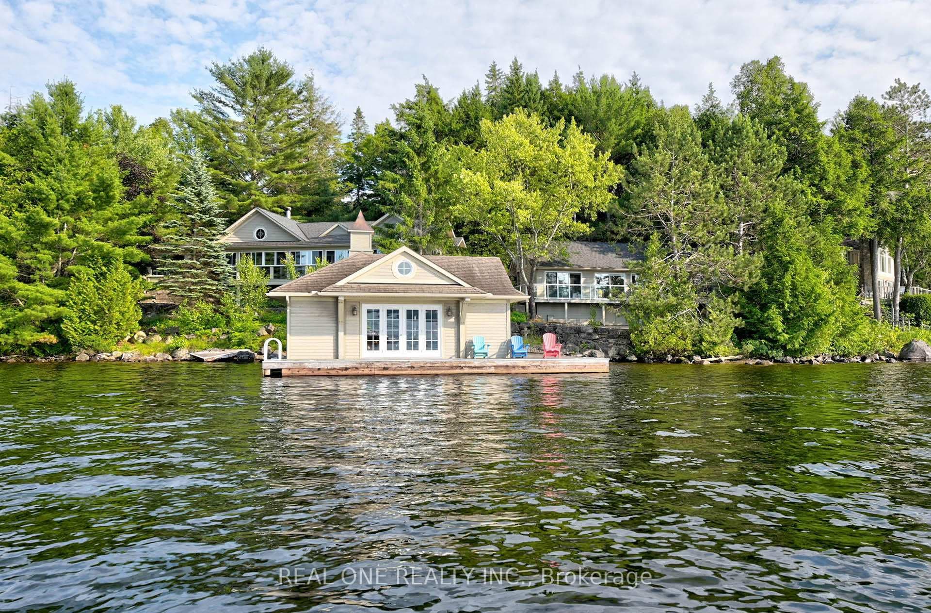 Prime Lake of Bays waterfront just outside Baysville, only a two-hour drive from the GTA, featuring 220 feet of pristine shoreline. This executive family compound offers two beautifully designed cottages. The main cottage boasts three bedrooms and two bathrooms, with a spacious open-concept Great Room that opens onto a 780 sq. ft. porch-perfect for entertaining or relaxing. The fully equipped two-bedroom and one bathroom guest cottage, complete with its own kitchen, is connected by professionally crafted stone pathways and patios, creating a seamless and inviting retreat for family and guests. Just steps from the water, the property includes a two-slip boathouse and generous dock, ideal for swimming, boating, and lakeside living. Enjoy breathtaking sunsets in this serene, private setting, while remaining just minutes from Bigwin Island.